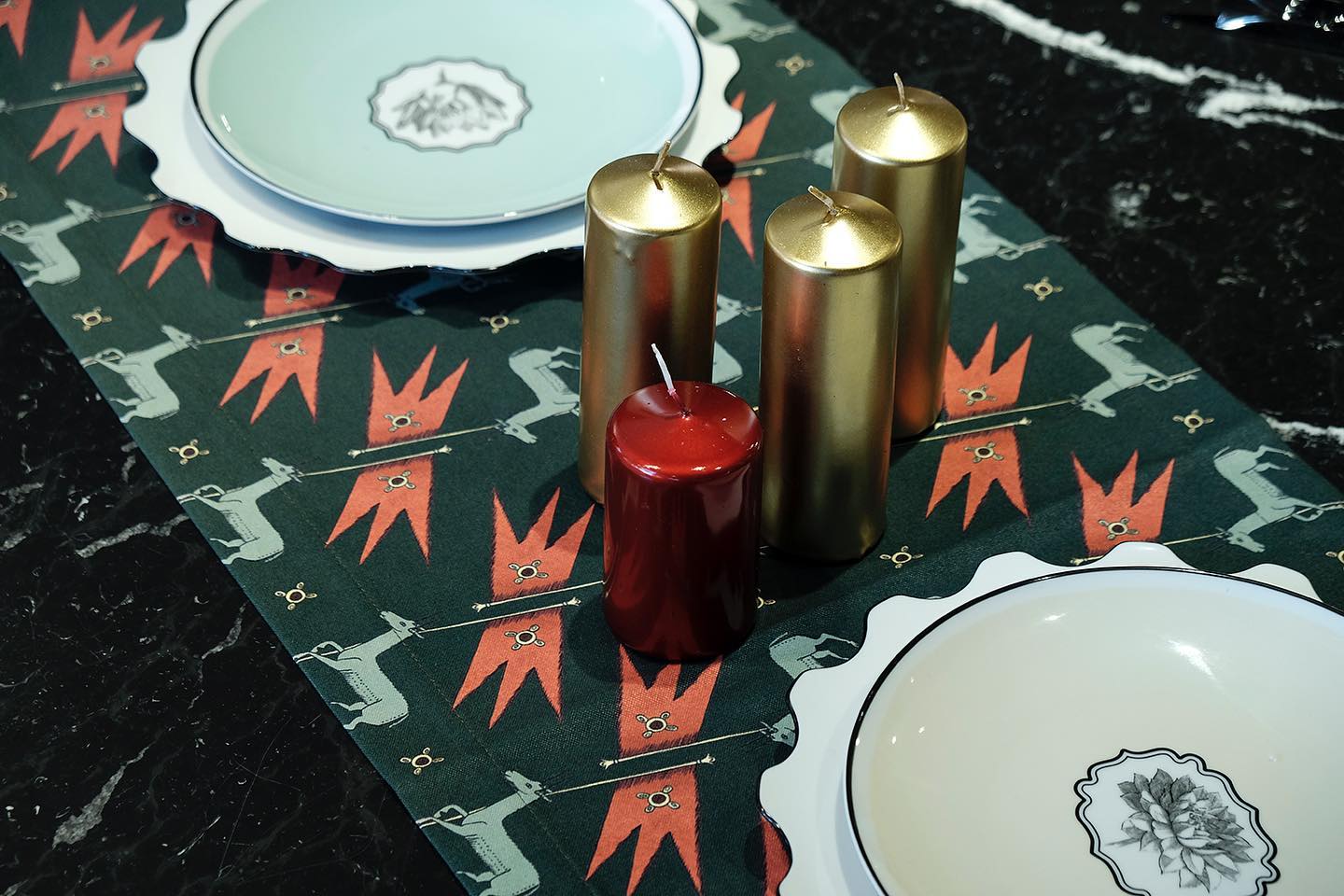 სუფრა. სუფრის პრინტი შეიქმნა ვახუშტი ბაგრატიონის გეოგრაფიულ ატლასში ასახული გერბების ინსპირაციით.