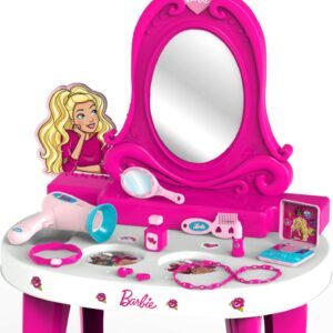 Playing with the Bildo kit has never been so much fun! You won't get bored with Barbie Vanity Studio . The set includes: a table with a large mirror, a chair, rings, a bracelet, a hair dryer, perfume, lipstick, a makeup palette, a necklace.