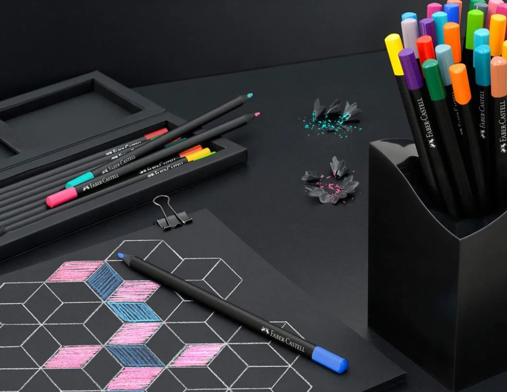 Faber Castell Triangular Standard Size Colored Pencils Set for Drawing on Black Paper. Bright, full colors specially selected by drawing teachers. The triangular shape is especially convenient for children's little fingers. Due to the special processing method (SV), the smooth pencil core is strong and does not leave excessive shadows when drawing, which ensures better paper coverage and excellent results.