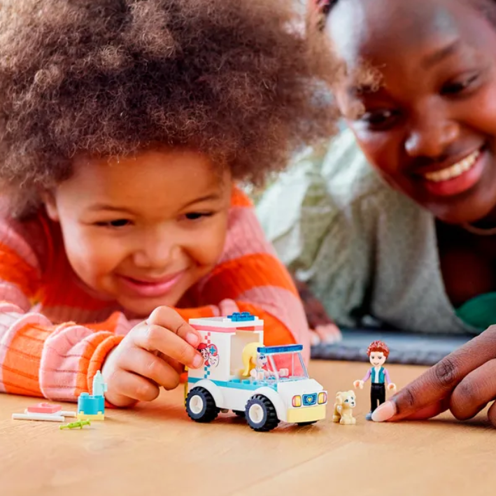 With the Friends Pet Clinic Ambulance play set, children can have fun playing. Great for kids who love to take care of animals. They go to help stray dogs and learn to stand by each other. They drive an ambulance with an opening back door, a stretcher and accessories for animals. This easy-to-build build includes LEGO® Friends figures – Stephanie, Ethan, a dog figure and an ambulance. The dimensions of the ambulance are: 6 × 9 cm
