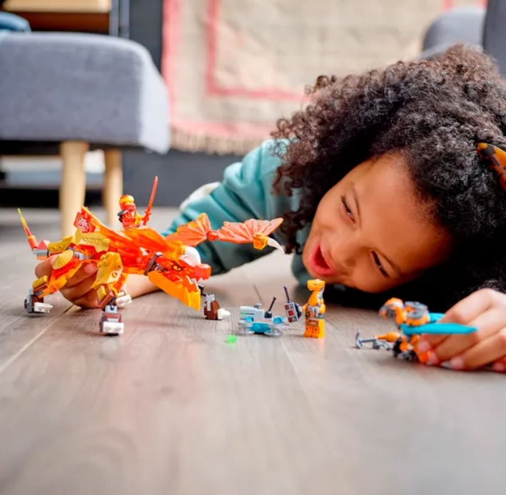 Lego Ninjago will take children to a world full of daring adventures! Kids will create amazing battles and adventures with this set. The set includes two minifigures: Kai armed with a melee weapon; Boa with drone flight control device; Cobra Mechanic with a flying device that shoots a chain, the toy dragon has movable limbs, jaws, head. The assembled dragon figure measures 32 cm.