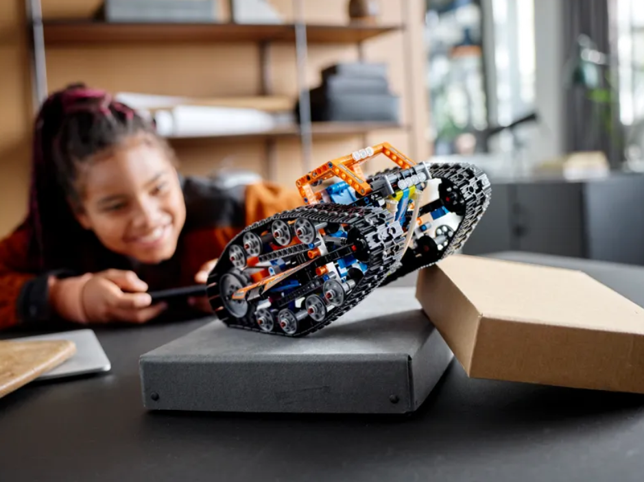 The App-Controlled Transformation Vehicle brick set builds into two types of vehicles. One of them hits the wall, and when you turn it over, you get a different visual car - one side is an aerodynamic car, and the other side is a scientific one. Kids can drive the car through the app.